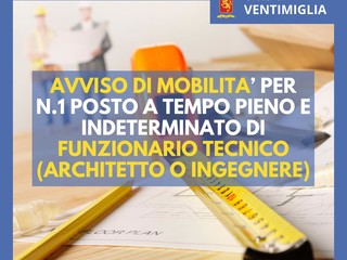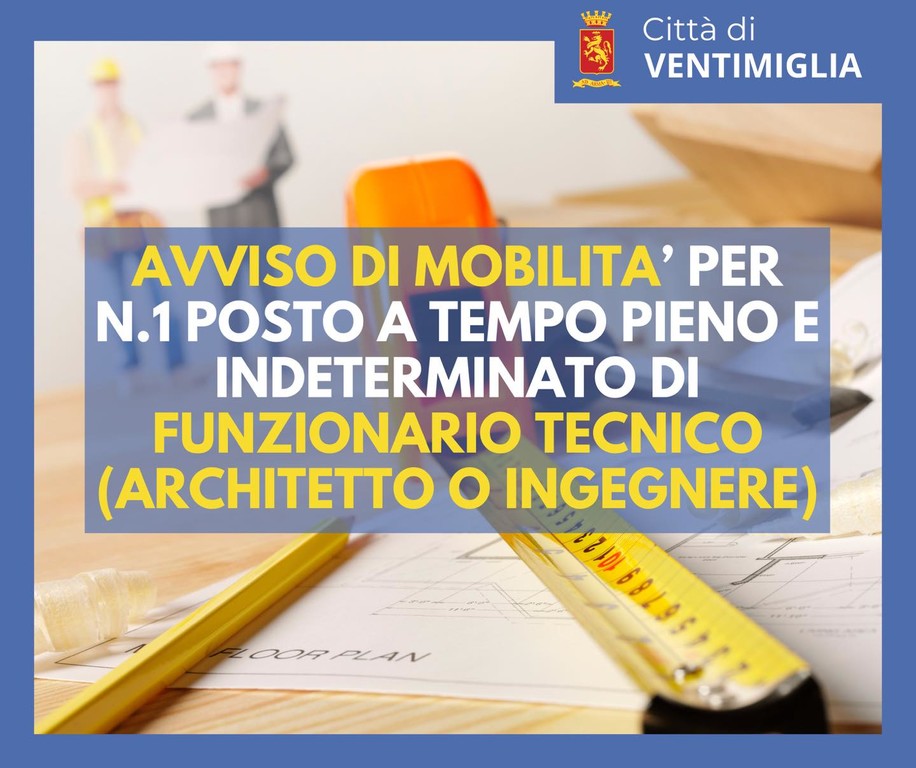 Il comune di Ventimiglia cerca un funzionario tecnico. E' stato, infatti, pubblicato un avviso di mobilità per la copertura di un posto nell'area dei funzionari, come architetto o ingegnere, a tempo pieno e indeterminato.