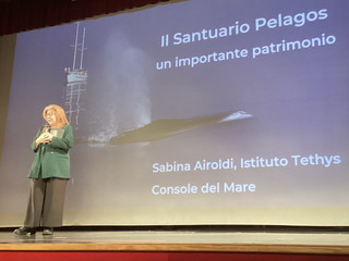 "Gli studenti dell’ITTL 'A.Doria', già Istituto Nautico, accompagnati dal loro docente Prof. Timm, sono stati i primi ad ascoltare gli interventi della giornata. Dopo i saluti e ringraziamenti istituzionali da parte dell’assessore Sara Tonegutti la biologa Sabina Airoldi ha ampiamente illustrato le principali caratteristiche degli otto cetacei presenti in Mediterraneo e nelle acque del Santuario Pelagos. Evidenzia la vitale importanza del 'fitoplancton'. Le analisi del gruppo Thethys, del quale è appassionata ricercatrice, spaziano nei campi vasti della biologia marina e della tecnologia, al fine di far comprendere e difendere questo mondo di biodiversità da molti apprezzato, ma ancora insufficientemente divulgato. Vi sono spazi occupazionali per la ricerca, la corretta impostazione delle attività di 'Whale watching' nel Santuario Pelagos e nel mondo".