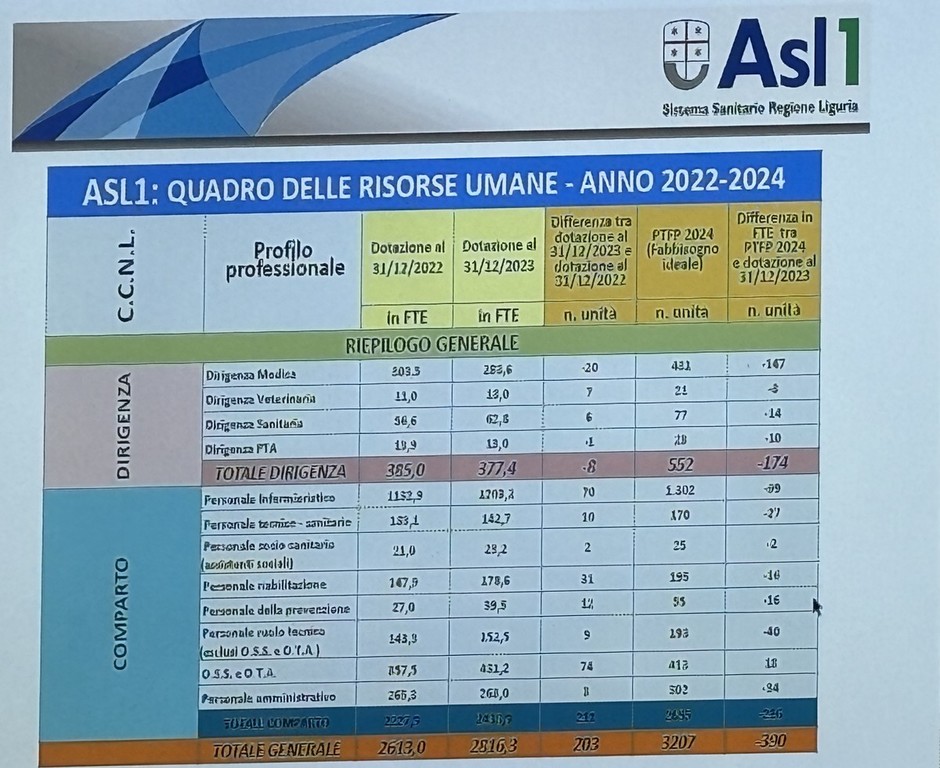 Da un lato la buona notizia: il punto nascite di Sanremo ha riparto e dal 15 febbraio sono nati già 6 bimbi. Dall’altro una malattia ormai cronica per l’As1: la carenza di personale. In totale mancano 390 unità, 174 delle quali in dirigenza.