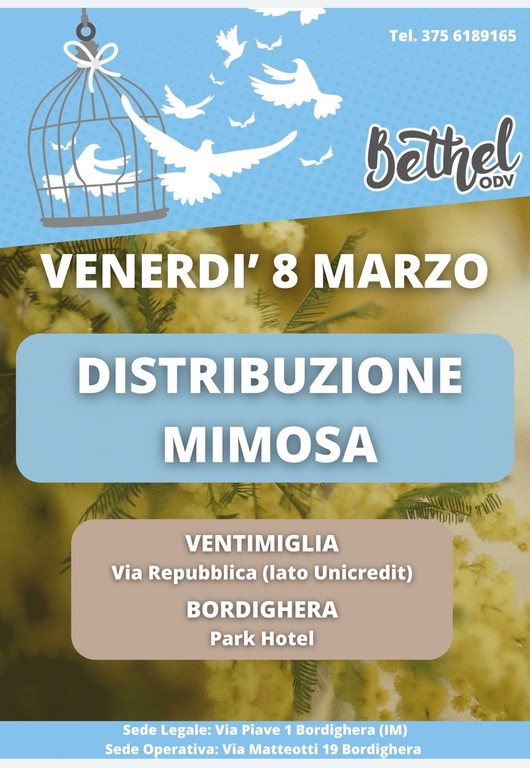 I gazebo saranno collocati in via Repubblica, vicino alla Banca UniCredit, nella città di confine e davanti al Park Hotel nella città delle palme dalle 10 alle 12.30. "Consegneremo mazzetti di mimosa, ad offerta libera" - fa sapere l'associazione Bethel Odv - "Sarà un'occasione per illustrare i nuovi progetti a cui ci dedicheremo nei prossimi mesi".