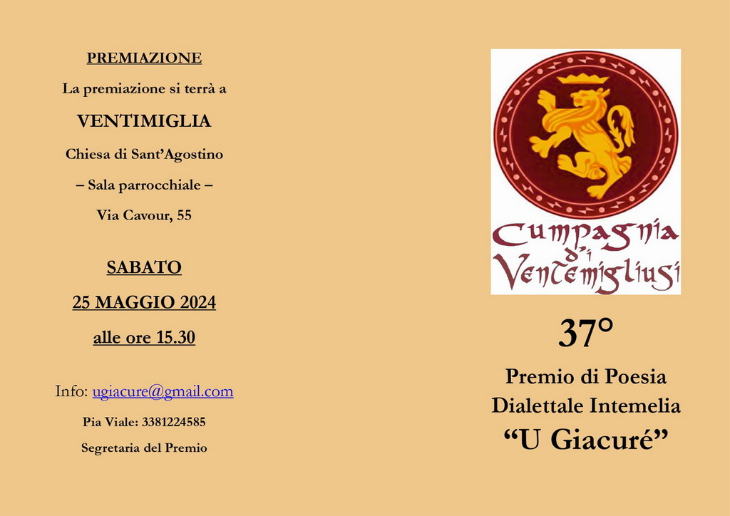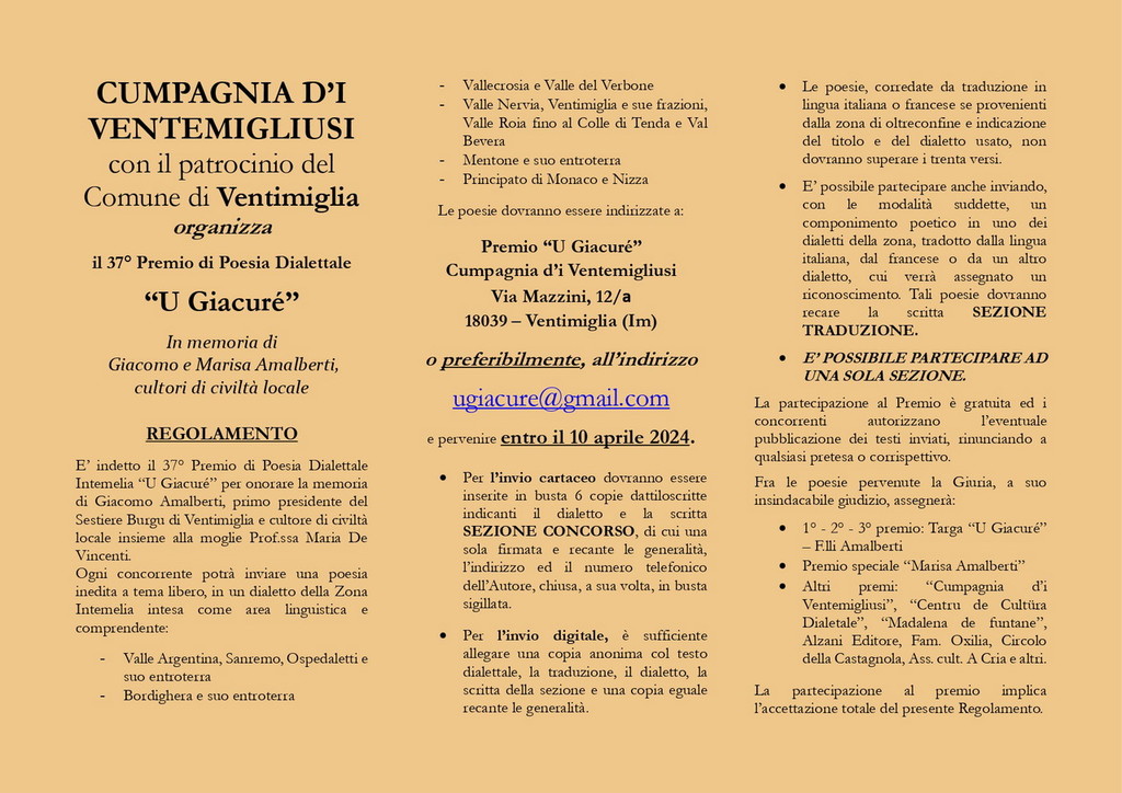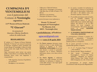 L’associazione ‘A Cumpagnia d'i Ventemigliusi’ ha indetto il XXXVII Premio di Poesia Dialettale Intemelia U Giacuré. Il tradizionale concorso, che per 10 anni è stato curato dall’Associazione culturale A Cria di Vallebona, con questa edizione modifica il regolamento, inserendo la SEZIONE TRADUZIONI, affinché possa esserci una facilitazione all'approccio con il dialetto per coloro che vogliano cimentarsi.