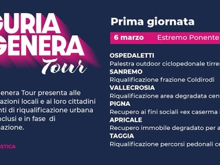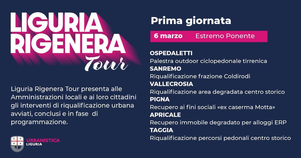 Il tour dell'assessore Scajola proseguirà nel pomeriggio: alle 14 presso l’ex caserma Motta a Pigna, che verrà recuperata per fini sociali, alle 15 in via IV Novembre ad Apricale dove verrà recuperato un immobile degradato per realizzare alloggi Erp e alle 16.30 in piazza Spinola a Taggia per la riqualificazione dei percorsi pedonali nel centro storico. E' la prima di cinque tappe in 26 comuni della Liguria, tra i cantieri conclusi, presenti e futuri di rigenerazione urbana per condividere con le amministrazioni locali e i cittadini gli interventi messi in campo dalla Regione Liguria in questi anni. I cantieri riguardano, infatti, opere di rigenerazione urbana, finanziate con fondi della legge 145/2018 e del Fondo strategico regionale, di edilizia residenziale sociale e di edilizia scolastica. Dal 2021 a oggi, con il bando di Rigenerazione urbana sono stati sovvenzionati 113 interventi per quasi 23 milioni di euro a cui si aggiungono ulteriori interventi del Fondo strategico regionale e del Piano Qualità dell'Abitare con opere attivate che complessivamente superano i 70 milioni di euro di finanziamenti e i 100 milioni di euro di lavori.