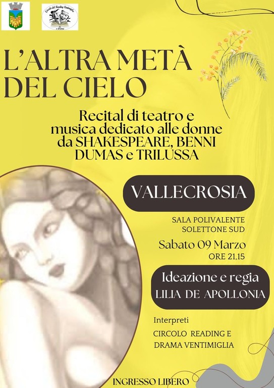 Un recital di teatro e musica dedicato alle donne dal titolo "L'altra metà del cielo" andrà in scena nella sala polivalente, sul solettone sud, a Vallecrosia sabato prossimo, il 9 marzo, alle 21.15.