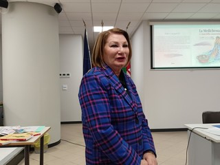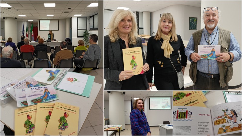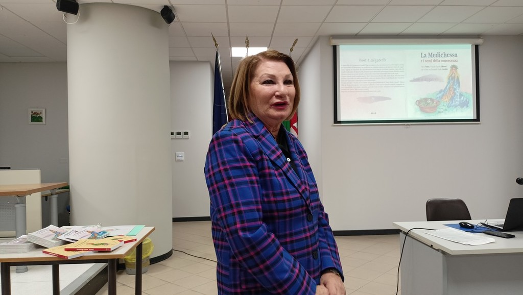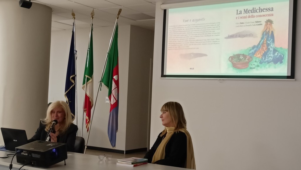Il pubblico presente ha ascoltato con interesse ed attenzione gli interventi sulla figura della medichessa e delle donne medici nella storia. "Tutto è iniziato con il testo 'Donne medici e speziali' nato per fornire una consapevolezza di base sulla salute attraverso la conoscenza della storia della medicina. Un libro che ho realizzato in collaborazione con il professor Gianfranco Trapani a garanzia della precisione scientifica del testo. L’iconografia originale è stata creata da Claudio Tabasso. E' nata poi 'La Medichessa e i semi della conoscenza', che è, quindi, figlia di 'Donne medici e speziali'. E' un libretto con testi, filastrocche con rime e disegni ad acquerello"- racconta Fulvia Natta, che è nata e cresciuta a Sanremo dove ha maturato una “naturale” vocazione al linguaggio dei fiori. Docente di storia all’Agraria e referente per l’Educazione alla cura, ha diretto il progetto “Le erbe della salute” realizzando la pubblicazione dell’omonimo libretto. Ha contribuito a manifestazioni pubbliche cittadine come il Festival della Salute e La Forza della Natura, lavorando sulla specificità di tematiche territoriali e ambientali. Laureata in Lettere e Filosofia ha approfondito gli studi etnografici e antropologici con particolare riferimento alle erbe e le cure nelle tradizioni dei popoli. Dal 2020 collabora con la casa editrice Mille di Torino e attualmente si sta occupando dei mestieri e delle tradizioni di cura nelle valli occitane. Con il supporto scientifico di rinomati medici e agronomi ha guidato i suoi alunni a prestigiosi riconoscimenti, come il Premio Letterario Professionale Lions (2018) e quello del Primo Concorso SIFO ( Società Italiana di Farmacia Ospedaliera 2020).
