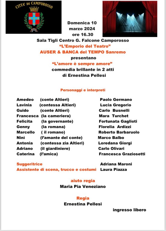 Andrà in scena, oggi pomeriggio alle 16.30, presso la Sala dei Tigli del centro G. Falcone a Camporosso una commedia brillante in due atti di Ernestina Pellesi dal titolo 'L’amore è sempre amore'.