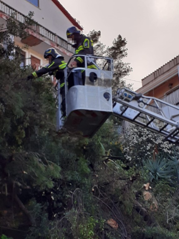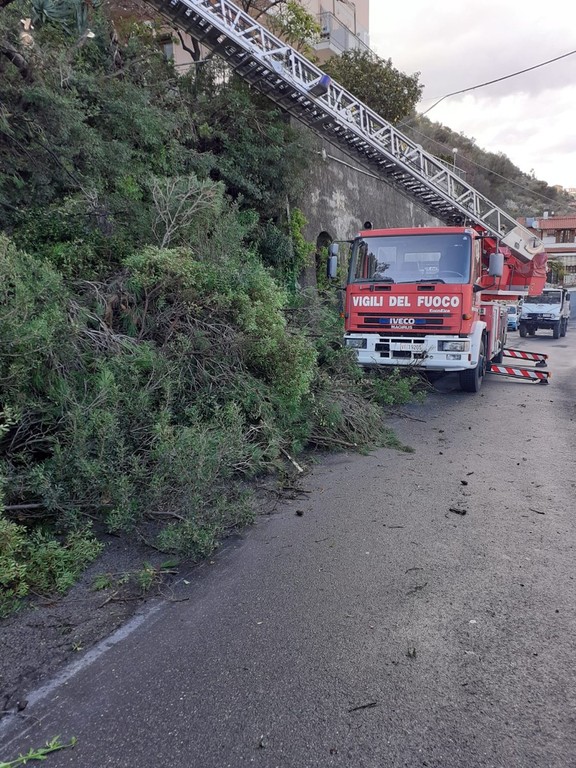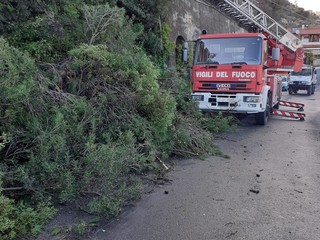Intervento dei vigili del fuoco nel pomeriggio odierno per un pino caduto sulla strada che porta a Ciaixe, sopra a Camporosso, a causa del maltempo che si è abbattuto sulla nostra provincia.