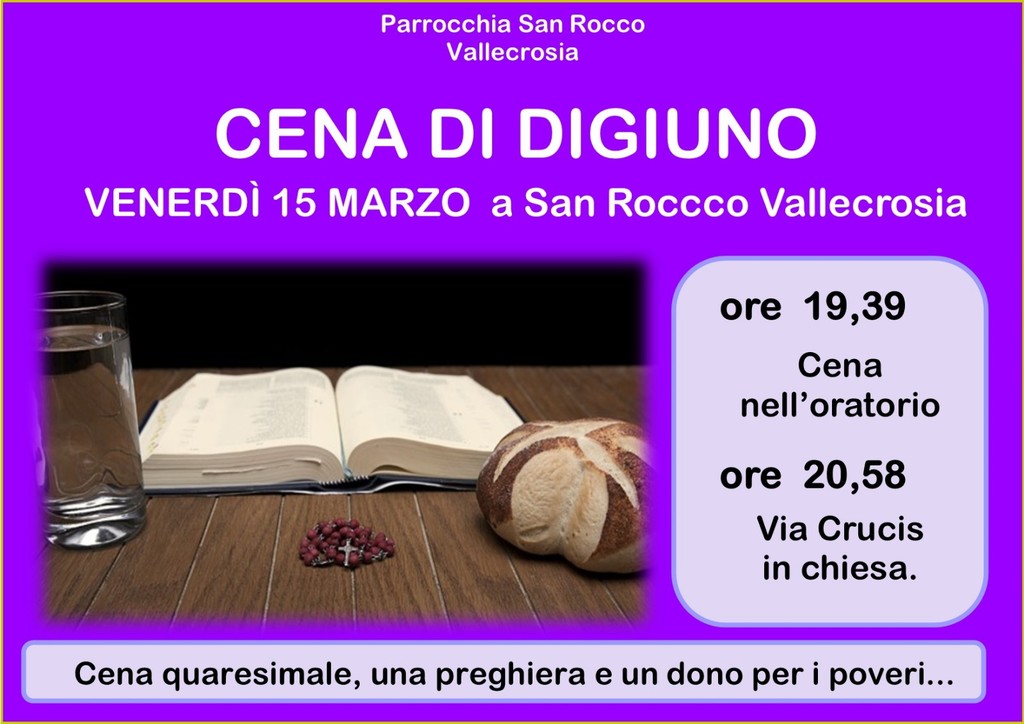 Un momento conviviale, in silenzio e raccoglimento, e di preghiera, con la via Crucis, in preparazione alla Quaresima ma anche un'occasione per aiutare i meno fortunati. E' stata un successo la cena di digiuno, andata in scena, ieri sera, nell'oratorio della parrocchia di San Rocco a Vallecrosia.