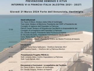 Prevenzione demenze e ictus al centro del progetto Interreg VI-A Francia-Italia Alcotra 2021-2027 “Preve.D.I." che verrà illustrato giovedì 21 marzo dalle 17 al Forte dell’Annunziata a Ventimiglia. Un evento per lanciare il progetto che ha l’obiettivo di prevenire l’insorgenza dell’ictus e delle demenze attraverso un’attività di informazione della popolazione di riferimento, formazione dei care giver e screening multi-generazionale nelle famiglie colpite dalla malattia.