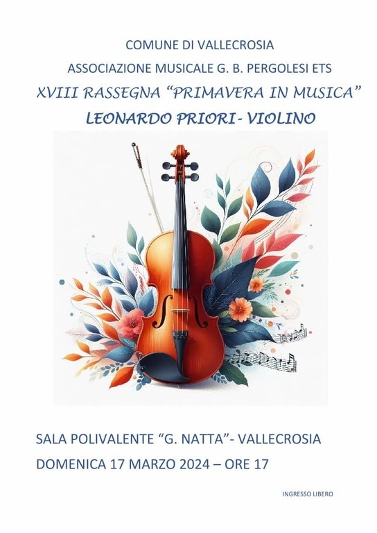 "Primavera in musica" a Vallecrosia. Tornano i concerti dell'associazione musicale G.B. Pergolesi Ets nella sala polivalente Giacomo Natta sul solettone sud. Un "Recital di violino" aprirà, oggi pomeriggio alle 17, la XVIII rassegna concertistica caratterizzata, quest'anno, d quattro concerti.