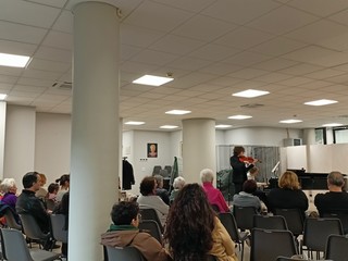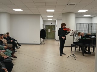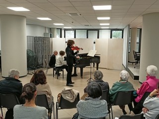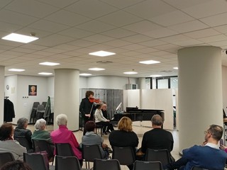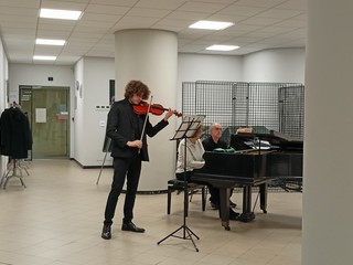 I presenti hanno ascoltato con piacere la Sonata numero 1 postuma per violino e pianoforte di Ravel, la Sonata numero 3 per violino solo di Bach e la Tzigane per violino e pianoforte di Ravel. "Leonardo Priori proviene da una famiglia musicista perché la mamma è pianista e clavicembalista e il papà è compositore. Oggi ci fa ascoltare i tre brani con i quali si laureerà tra pochi giorni. Sono solo tre brani perché sono abbastanza lunghi e complessi. Il primo brano è una Sonata postuma di Ravel e bisogna immaginarla come una serie di immagini e chiazze sonore, il secondo brano è una Sonata di Bach che farà da solo ed è divisa in quattro parti: adagio, fuga, largo e allegro finale. Infine, il terzo brano è una Tzigane di Ravel" - fa sapere Adriana Costa dell'associazione musicale G.B. Pergolesi Ets che ha accompagnato al pianoforte Priori.