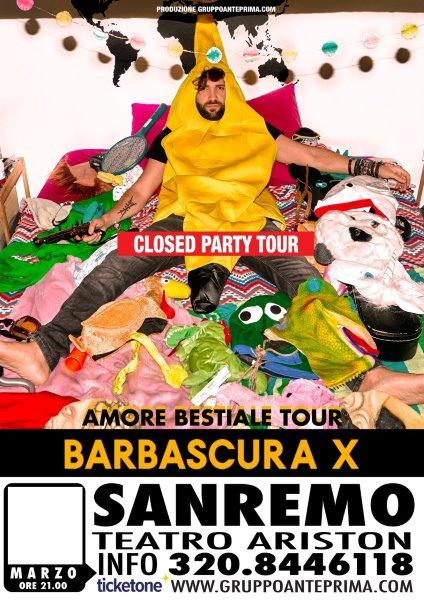 Mercoledì 20 marzo (ore 21.00), il chimico e divulgatore scientifico da un milione di follower sul web, Barbascura X, sarà protagonista al Teatro Ariston di Sanremo con l’ultima tappa del suo “Amore bestiale tour” in cui unisce cultura e divertimento. Biglietti disponibili in prevendita sul circuito online Ticketone. “Amore Bestiale tour” racconta rigorosamente “male”, come ricorda ironicamente Barbascura X, tutto quello che non volevate sapere sul sesso e che ignoravate di temere. È un viaggio irriverente sui metodi di accoppiamento più bizzarri e scomodi del regno animale.