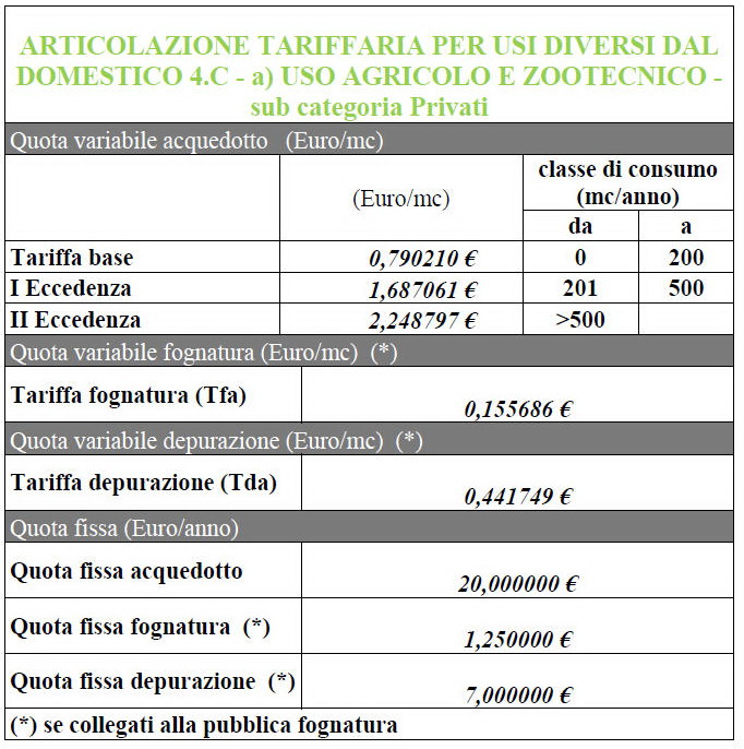 Per il comparto agricolo e zootecnico (sub categoria privati) la tariffa base sarà di 0,790210 euro con le eccedenze a 1,687061 (201-500) e 2,248797 (sopra i 500). Per usi di versi dal domestico (agricolo e zootecnico imprenditori), la tariffa base 0,646536, prima eccedenza 1,165744 (da 1001 a 20000) seconda a 1,247097 (sopra i 20000).