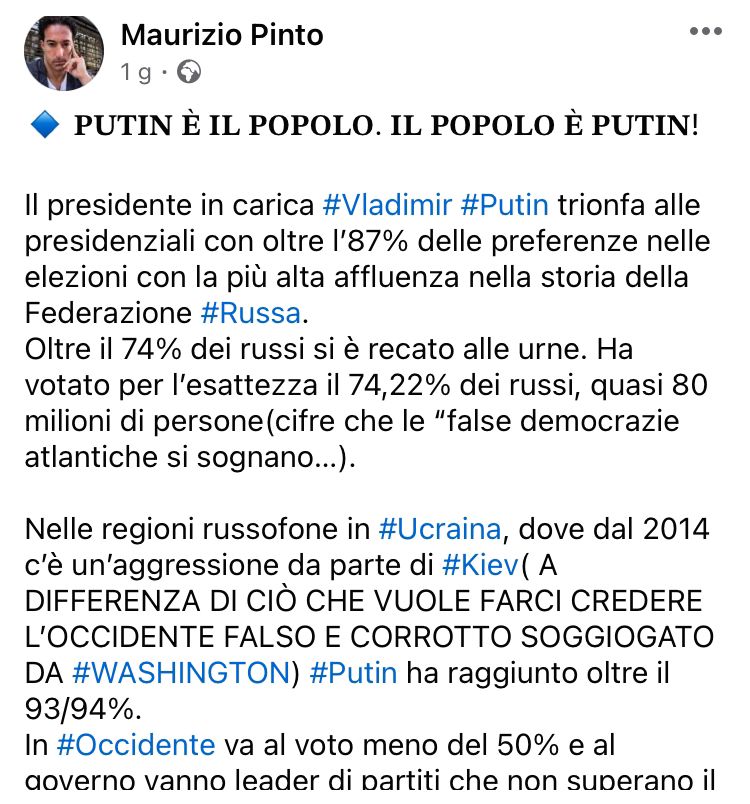 "Certo, rimane l’amarezza, chiosa Quesada, a più di due anni dalla criminale invasione dell’Ucraina e a pochi giorni dai video che mostravano militari armati entrare nelle cabine elettorali per controllare il voto dei cittadini russi, pensare che ci sia ancora chi difende questo regime criminale, ma il mondo è bello perché è vario (Pinto). Con la speranza che il signor Pinto, conclude il segretario Pd, non voglia importare la straordinaria democrazia russa anche qui, noi restiamo fermamente dall’altra parte: quella della democrazia, della libertà e del rispetto del diritto internazionale e della dignità umana”.