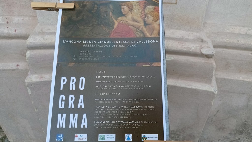 La presentazione del restauro introduce la Giornata Fai di Primavera che verrà ospitata a Vallebona domenica prossima. "Introduce la Giornata FAI di Primavera, atteso e consolidato appuntamento, previsto domenica, che la delegazione imperiese ha organizzato per valorizzare Vallebona e le sue eccellenze architettoniche ed artistiche" - sottolinea Maria Carmen Lanteri, presidente della delegazione Fai di Imperia.