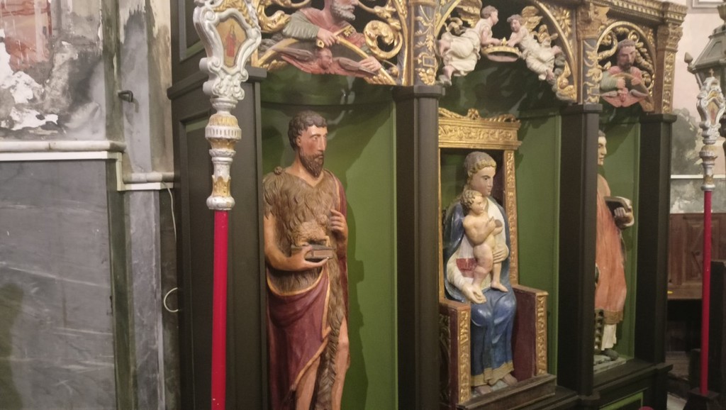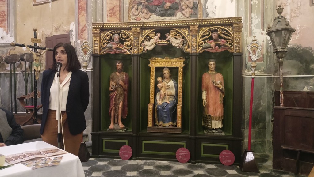 Grazie a un apposito finanziamento ministeriale le tre sculture sono state restaurate dalla ditta genovese Co.Art con la direzione del funzionario della Soprintendenza Paola Traversone. "In quella stessa circostanza era stato possibile riconoscere come appartenenti allo stesso insieme alcuni elementi, rinvenuti nell'adiacente chiesa parrocchiale di San Lorenzo martire" - fa sapere il direttore dell’Ufficio Beni Culturali Diocesano Valentina Silvia Zunino - "Si trattava di un pannello orizzontale lunettato recante, a rilievo, i mezzo busto dei santi Pietro, a sinistra, e Paolo, a destra, e angeli reggicorona al centro; al di sopra, trovava spazio un coronamento a mezza luna scolpito, raffigurante Dio Padre tra angeli, sormontato da una piccola figura di Putto reggente uno scudo crociato, elementi riutilizzati quale cimasa della cassa dell'organo Nicomede Agati e fratelli di Pistoia".