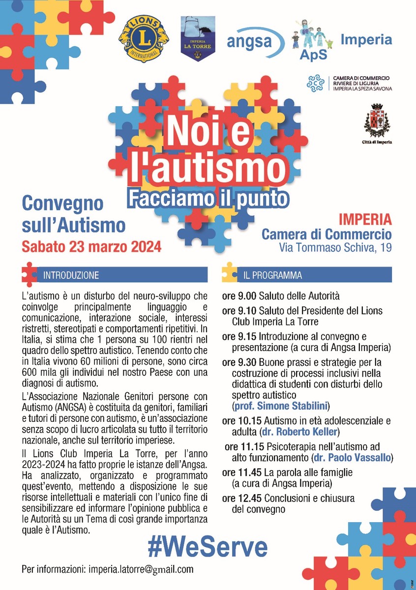 9.00. ‘Noi e l’Autismo – Facciamo il punto’: convegno sull’autismo a cura del Lions Club Imperia la Torre in collaborazione con ANGSA con relatori il prof. Simone Stabilini, studioso della neurodiversità, accademico all’Università Cattolica di Milano, il dottor Roberto Keller, specialista dell’autismo in età adolescenziale e adulta, e lo psicoterapeuta Paolo Vassallo, esperto in psicologia infantile. Auditorium della Camera di Commercio (locandina)