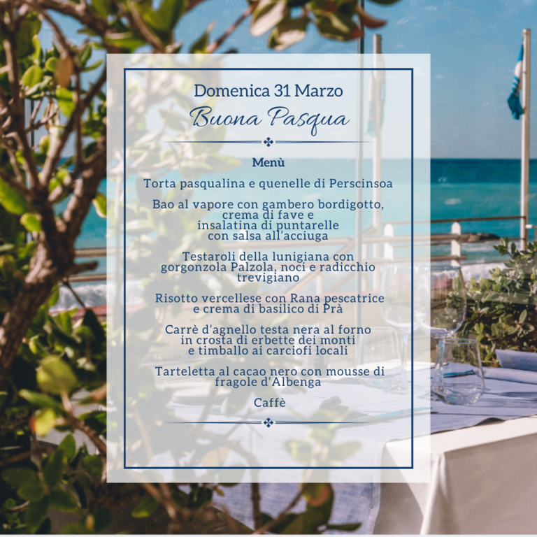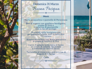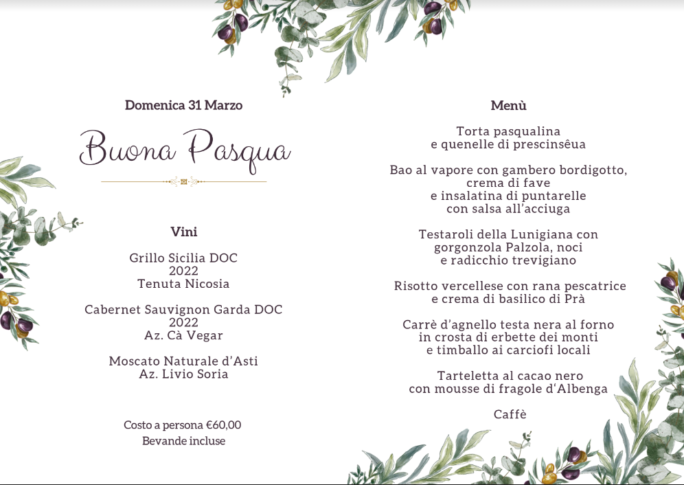 Il menù prevede torta pasqualina e quenelle di prescinsêua; bao al vapore con gambero bordigotto, crema di fave e insalatina di puntarelle con salsa all’acciuga; testaroli della Lunigiana con gorgonzola Palzola, noci e radicchio trevigiano; risotto vercellese con rana pescatrice e crema di basilico di Prà; carrè d’agnello testa nera al forno in crosta di erbette dei monti e timballo ai carciofi locali; tarteletta al cacao nero con mousse di fragole d‘Albenga e caffè.