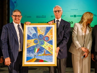 A Malagò è stata consegnata una opera d’arte realizzata dall’artista spezzino Nicola Perucca, pittore, illustratore e grafico che spiega così l’opera realizzata per questa occasione: “Ho cercato di rappresentare l'energia dell'uomo che, come un direttore d'orchestra, coordina, emana, fa muovere l'energia dello sport, di tutti gli sport. E tutto quanto si armonizza, prende posto nel grande campo da gioco della vita. I cinque anelli sono una galassia sempre nuova, sempre più importante”.