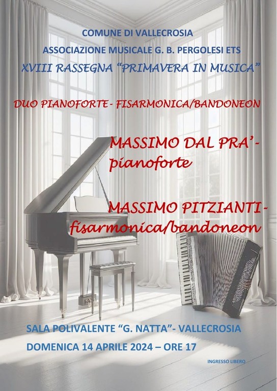 Il prossimo appuntamento con Primavera in musica sarà domenica prossima, il 14 aprile alle 17 nella sala polivalente con l'esibizione di un duo: Massimo Dal Prà al pianoforte e Massimo Pitzianti alla fisarmonica e bandoneon. L'ingresso è libero.
