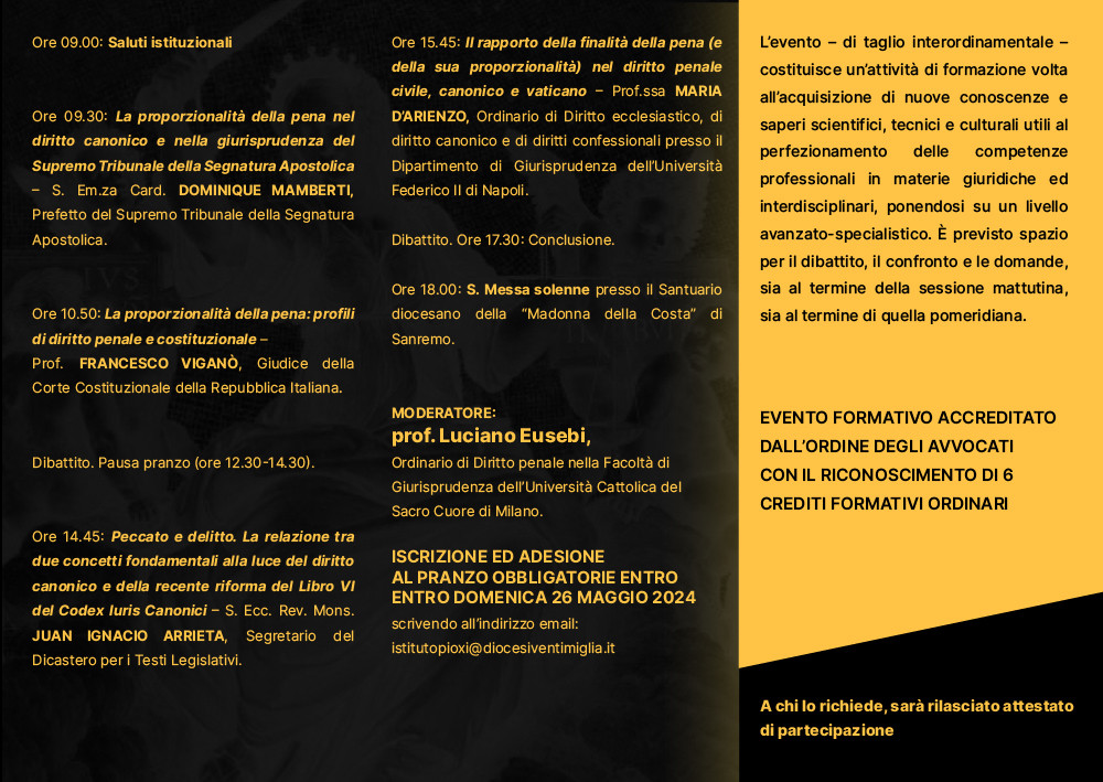 Sabato 1° giugno presso il Centro Don Orione in via Galilei di Sanremo (IM) l’Istituto Teologico “Pio XI” di Sanremo organizza una giornata studio dal tema: “Diritto penale e proporzionalità della pena, fra diritto civile, diritto canonico e diritto vaticano”.