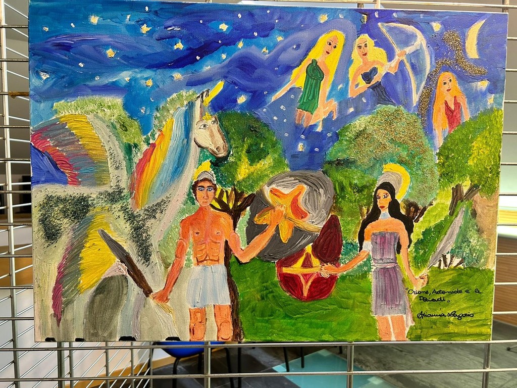 "Orione, Artemide e le Pleiadi": Uno dei quadri più rappresentativi della mostra, presentato alla 60° Biennale d'Arte di Venezia, incarna perfettamente l'essenza del viaggio onirico di Arianna.