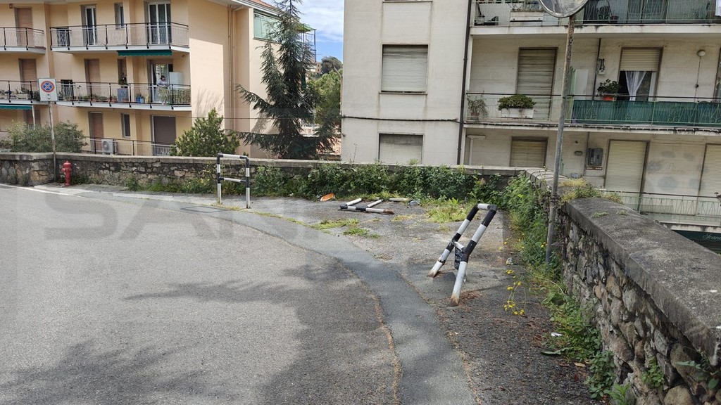 Sanremo: arredo urbano semidistrutto in via De Amicis, spunta anche un cartello goliardico (Foto)