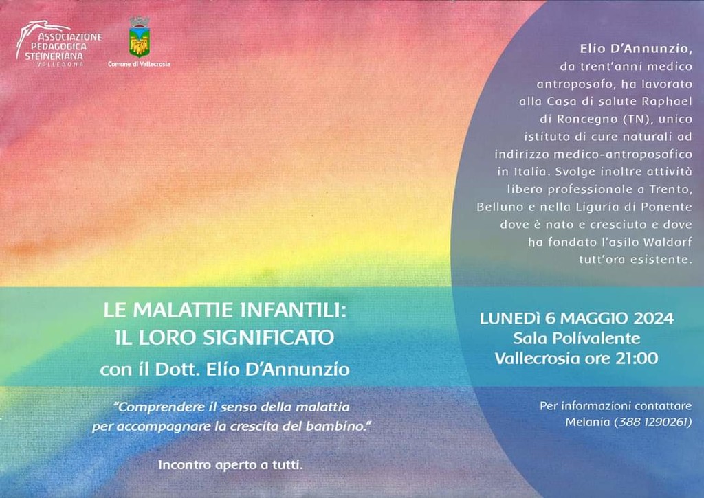 Il primo appuntamento, organizzato dall'associazione Pedagogica Steineriana di Vallebona con il patrocinio del comune di Vallecrosia, sarà lunedì 6 maggio alle 21 con il dottor Elio D'Annunzio sulle malattie infantili, il loro significato e su come comprendere il senso della malattia per accompagnare la crescita del bambino. Elio D'Annunzio da trent'anni è medico antroposofo, ha lavorato alla Casa di salute Raphael di Roncegno, unico istituto di cure naturali ad indirizzo medico-antroposofico in Italia. Svolge, inoltre, attività libero professionale a Trento, Belluno e nella Liguria di Ponente dove è nato, cresciuto e dove ha fondato l'asilo Waldorf tutt'ora esistente.
