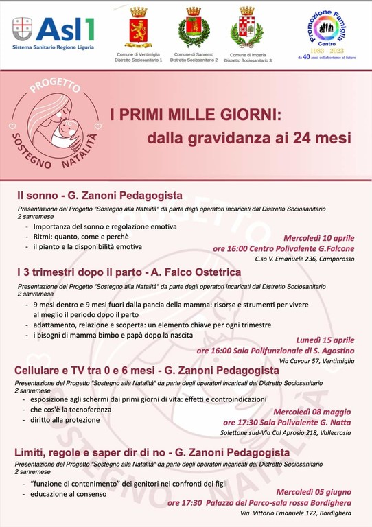 Mercoledì 8 maggio alle 17.30, infine, vi sarà un incontro su "Cellulare e tv tra 0 e 6 mesi" con il pedagogista Gabriele Zanoni. Per l'occasione verrà presentato il progetto "Sostegno alla natalità" da parte degli operatori incaricati dal distretto sociosanitario 2 sanremese. In particolare si parlerà dell'esposizione agli schemi dai primi giorni di vita: effetti e controindicazioni; che cos'è la tecnoferenza e del diritto alla protezione. L'appuntamento sarà il terzo di un ciclo di incontri "I primi mille giorni: dalla gravidanza ai 24 mesi" proposto dall'Asl1, da Promozione Famiglia Centro e dai comuni di Ventimiglia, Sanremo e Imperia con il patrocinio del comune di Vallecrosia.