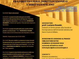 Sabato 1° giugno presso il Centro Don Orione in via Galilei di Sanremo (IM) l’Istituto Teologico “Pio XI” di Sanremo organizza una giornata studio dal tema: “Diritto penale e proporzionalità della pena, fra diritto civile, diritto canonico e diritto vaticano”.