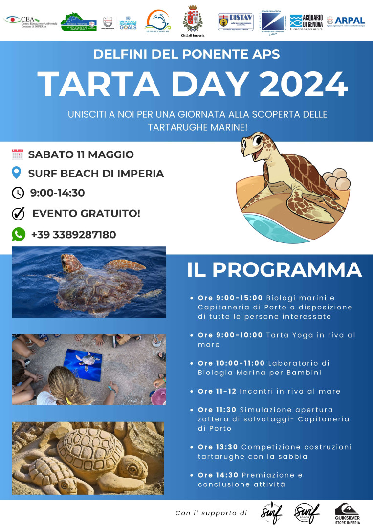 9.00-14.30. ‘Tarta Day 2024’: giornata alla scoperta delle tartarughe marine con numerose iniziative. Evento a cura dei Delfini Del Ponente APS in collaborazione con il Centro di Educazione Ambientale del Comune di Imperia. Spiaggia Surf Beach di Borgo Marina (per conoscere il programma della giornata cliccare questo link)