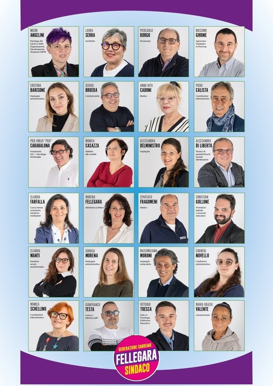 La lista è formata da quattro capi lista: Noemi Angelini e Laura Serra tra le donne, Piercarlo Borgo e Massimo Ghione. Gli altri sono: Morena Fellegara, Spartaco Fragomeni, Claudia Manti, Sergio Bruera, Claudia Farfalla, Vittorio Toesca, Cristian Gullone, Maria Valente, Massimo Ghione, Monica Schellino, Alessandro Di Liberto, Monica Casazza, Gianfranco Testa, Giorgia Morena, Pier Emilio Carabalona, Cristina Barisone, Massimiliano Moroni, Anna Rita Cadoni, Piero Calista, Chantal Novello ed Alessandra Delministro.