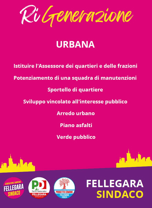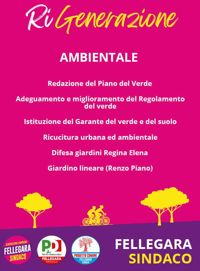 La floricoltura si lega alla questione di salvaguardia ambientale, che porta a un importante punto della lista di Fellegara, quello sul verde urbano che dev’essere preservato e se possibile potenziato. L’idea è quindi di andare a istituire un Piano del Verde e un Garante del Verde e del Suolo, arricchire la pista ciclabile con aree verdi intorno, realizzare percorsi pedonali e aree fitness, il tutto senza però dimenticare il sostegno alla balneazione, vero motore di Sanremo durante l’estate.