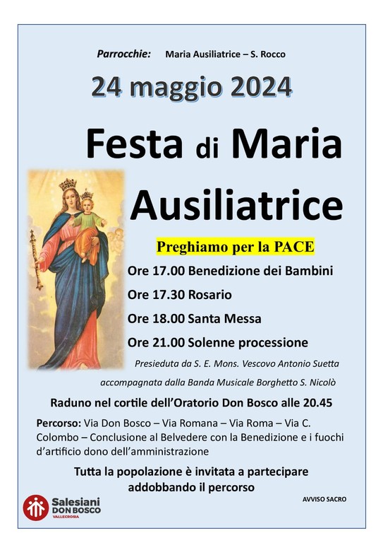 Benedizione dei bambini, rosario, santa messa, processione e fuochi d'artificio verranno organizzati a Vallecrosia in occasione della Festa di Maria Ausiliatrice, patrona principale della famiglia salesiana.
