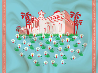 Il Casinò di Sanremo circondato da un campo di margherite su uno sfondo azzurro 'La goccia che fa rifiorire la vita' è lo slogan che campeggia in cornice al foulard realizzato per Fidas al fine di accrescere la coscienza trasfusionale e lo spirito solidaristico.