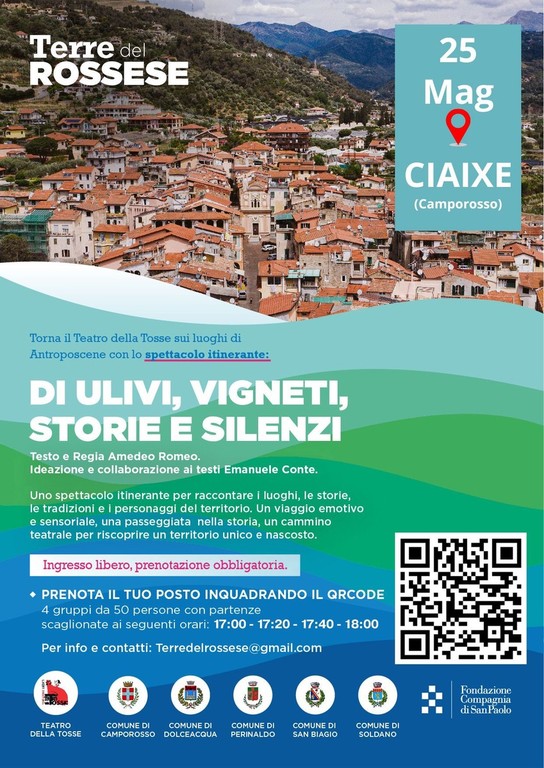 L'ingresso è libero ma la prenotazione è obbligatoria. "E' un evento che rientra nel progetto di Terre del Rossese" - sottolinea Celi - "E' una camminata che si sarebbe dovuta tenere quest'autunno ma che abbiamo dovuto rinviarla a causa del maltempo. La faremo sabato e perciò chi vorrà partecipare dovrà prenotare il proprio posto inquadrando il QR code sulla locandina o iscriversi gratuitamente all'app eventbrite. Vi saranno quattro gruppi da cinquanta persone con partenze scaglionate alle 17, alle 17.20, alle 17.40 e alle 18. Per informazioni si può contattare terredelrossese@gmail.com".