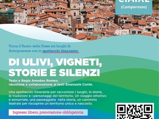 Per l'occasione il Teatro della Tosse porterà in scena "Di ulivi, vigneti, storie e silenzi", testo e regia di Amedeo Romeo con ideazione e collaborazione ai testi di Emanuele Conte, sui luoghi di Antroposcene. "Sabato pomeriggio organizziamo un evento unico: un trekking teatrale. Un un viaggio emotivo e sensoriale ma anche una passeggiata nella storia e un cammino teatrale per riscoprire un territorio unico e nascosto" - fa sapere l'assessore di Camporosso Cristiana Celi - "I partecipanti cammineranno lungo un percorso che si snoderà a Ciaixe che sarà intervallato da intermezzi teatrali degli attori del Teatro della Tosse".