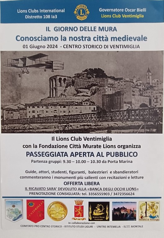 Il prossimo sabato 1 giugno a Ventimiglia con partenza da Porta Marina dalle ore 9.30, 10 e 10 e 30, i soci Lions ed esperti di storia locale condurranno cittadini e turisti alla conoscenza di angoli poco noti della città medievale e delle sue ricchezza artistiche.