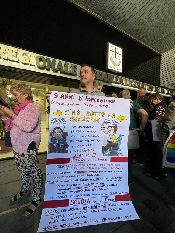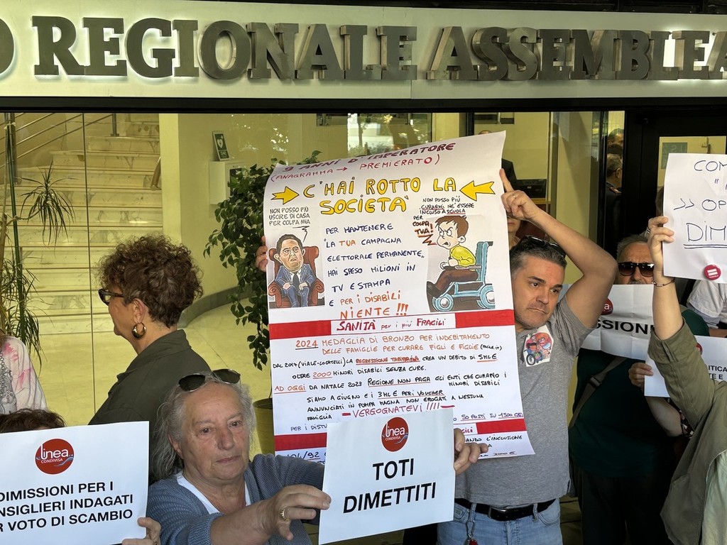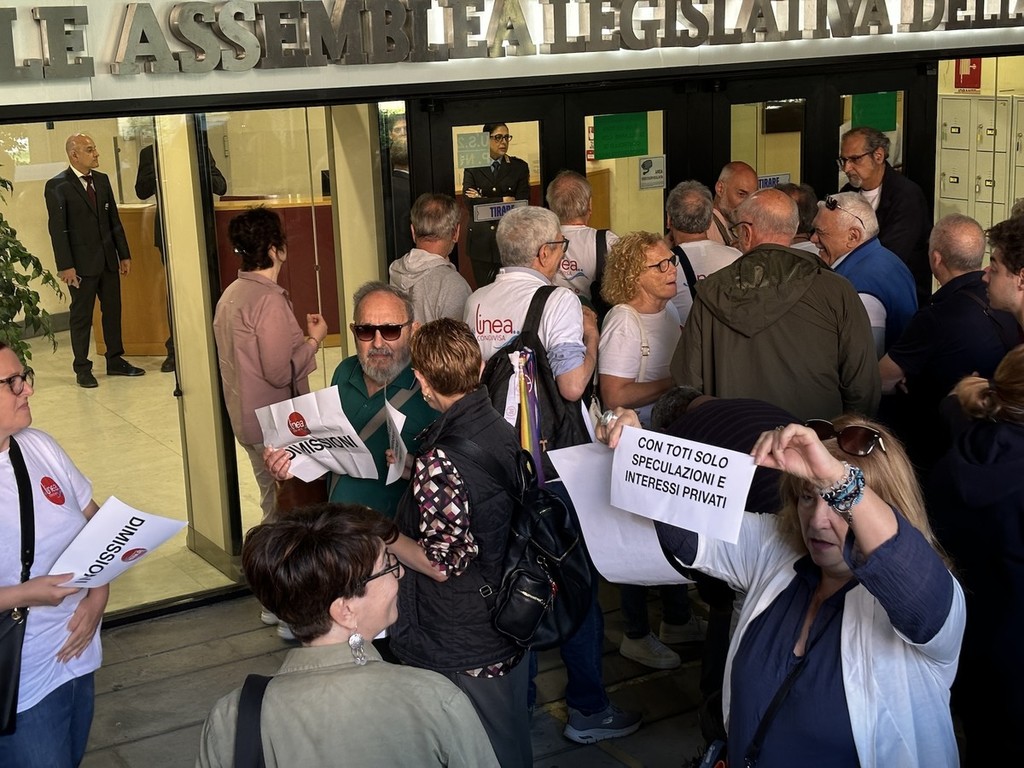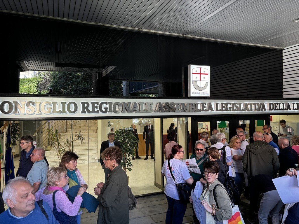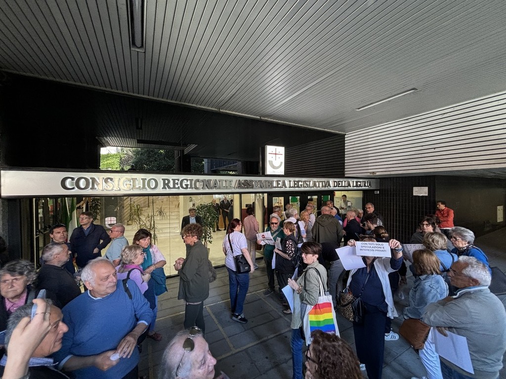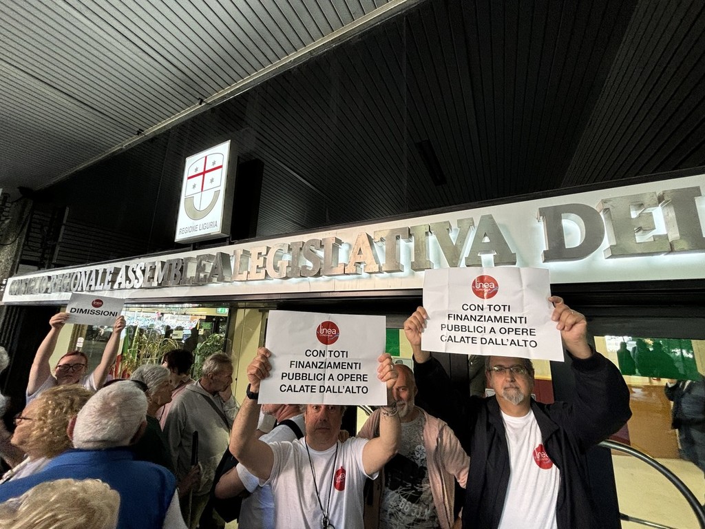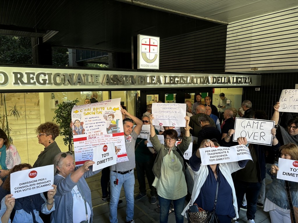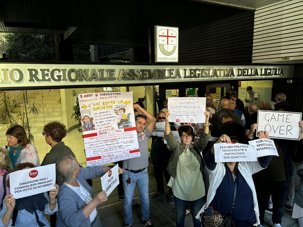 “Game over”. Due sole brevi parole per riassumere il pensiero delle associazioni che questa mattina, come annunciato, si sono date appuntamento davanti alla sede del consiglio regionale ligure per chiedere le dimissioni del presidente Giovanni Toti, agli arresti domiciliari dal 7 maggio con le accuse di corruzione e falso. Cartelloni, striscioni e slogan fuori dall’assise per poi entrare in un’aula in cui si respira un’aria di tensione ormai da alcune settimane.