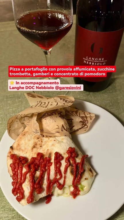 La cena è proseguita con la Pizza a portafoglio con provola affumicata, zucchine trombetta, gamberi e concentrato di pomodoro, servita con un calice di Langhe DOC Nebbiolo Garesio.