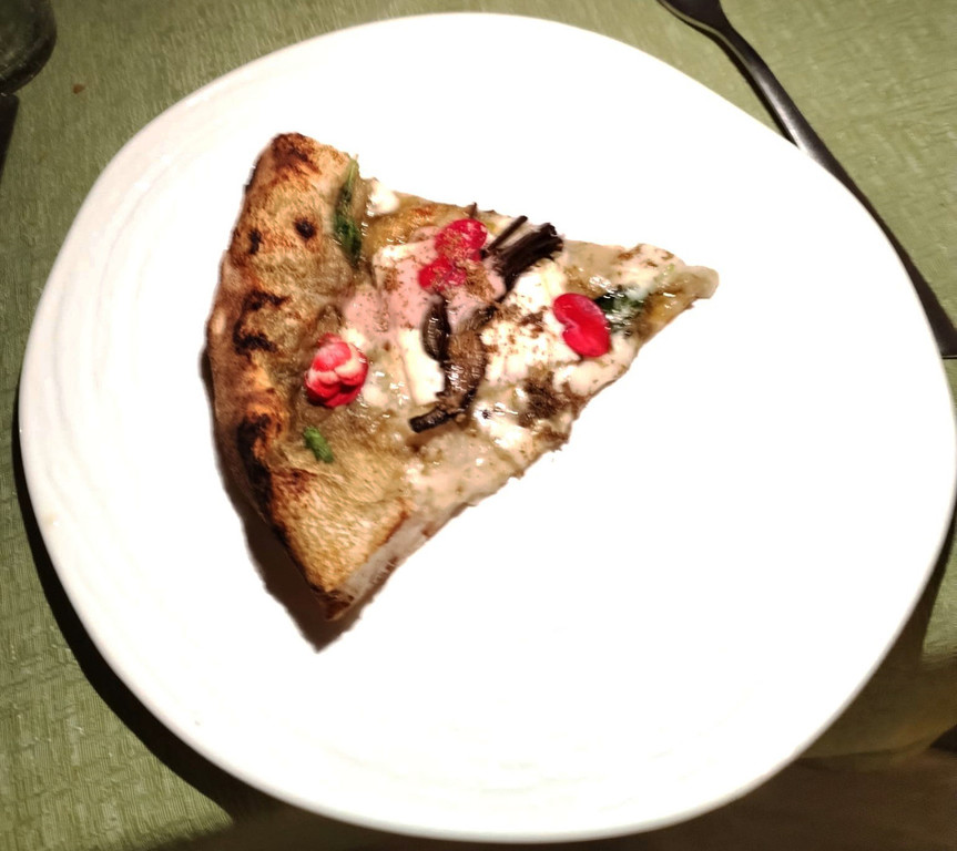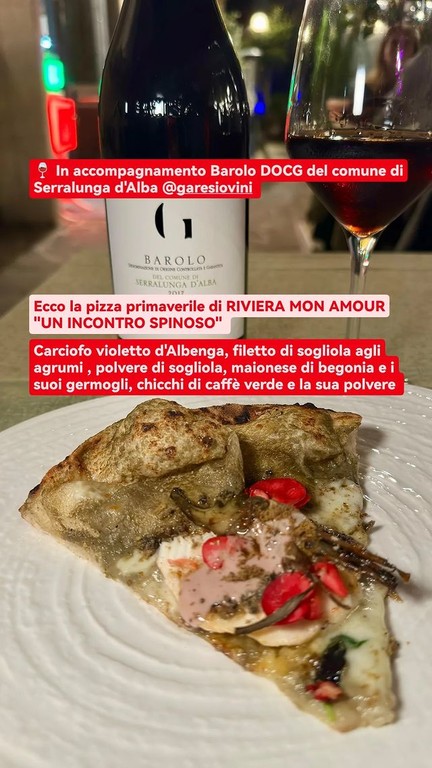 E in ultimo la nuova creazione di Senese, la Napoletana in evoluzione "Incontro Spinoso", accompagnata da un Barolo DOCG del comune di Serralunga d'Alba Garesio. Una pizza dedicata alla primavera, dove il Carciofo violetto di Albenga presidio Slow food viene proposto in tre consistenze (yogurt, crema e arrosto), insieme al filetto di Sogliola agli agrumi, la polvere di sogliola disidratata, ed un tocco di grande raffinatezza con la maionese di Begonia e olio di caffè verde.