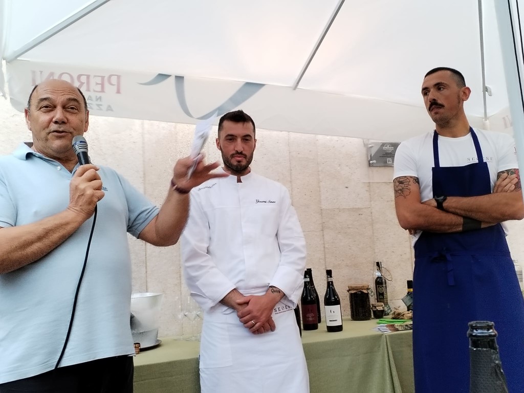 Un grande successo ottenuto grazie alla perfetta sinergia tra i due chef e alle eccellenze proposte in ogni piatto, che, oltre alle verdure dell’orto curato da Senese e le erbe spontanee raccolte da Enrico Marmo, comprendevano i formaggi dell’azienda Cornus di Rezzo, l’olio Evo del frantoio Sant’Agata di Oneglia, le acque di San Benedetto ed i vini della cantina Garesio, che hanno saputo esaltare al meglio i sapori dei piatti.