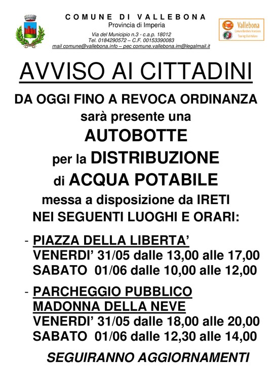 A Vallebona arriva un'autobotte, messa a disposizione di Ireti, per la fornitura di acqua potabile. Sarà a disposizione della cittadinanza in seguito all'ordinanza di divieto di utilizzo dell'acqua ad uso potabile, in via precauzionale, su indicazione del Dipartimento Prevenzione dell’Asl1.