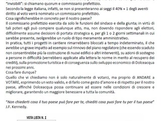 "Cosa fare dunque? Quello che vi chiediamo non è solo naturalmente di votarci, ma proprio di andare a votare, esprimendo un voto valido, e di farlo come gesto d’amore e di rispetto per il nostro paese, affinché Dolceacqua possa continuare ad essere nelle condizioni di crescere e migliorare, garantendo un maggiore benessere a tutta la comunità" - mette in risalto Gazzola - "'Non chiederti cosa il tuo paese può fare per te, chiediti cosa puoi fare tu per il tuo paese' diceva J.F. Kennedy".