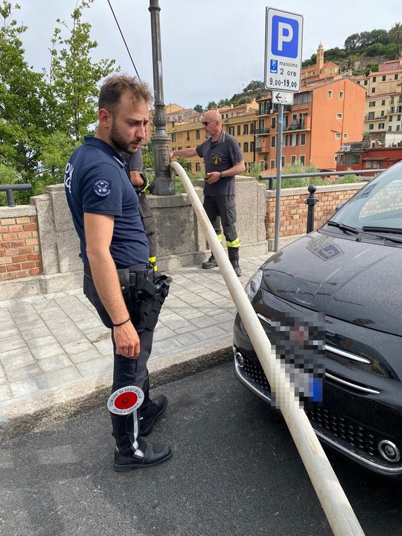 Un palo cade e danneggia un'auto. E' successo oggi pomeriggio a Ventimiglia. Il forte vento ha, infatti, contribuito a far precipitare un palo della Rivera Trasporti su una macchina in sosta sul ponte Doria.