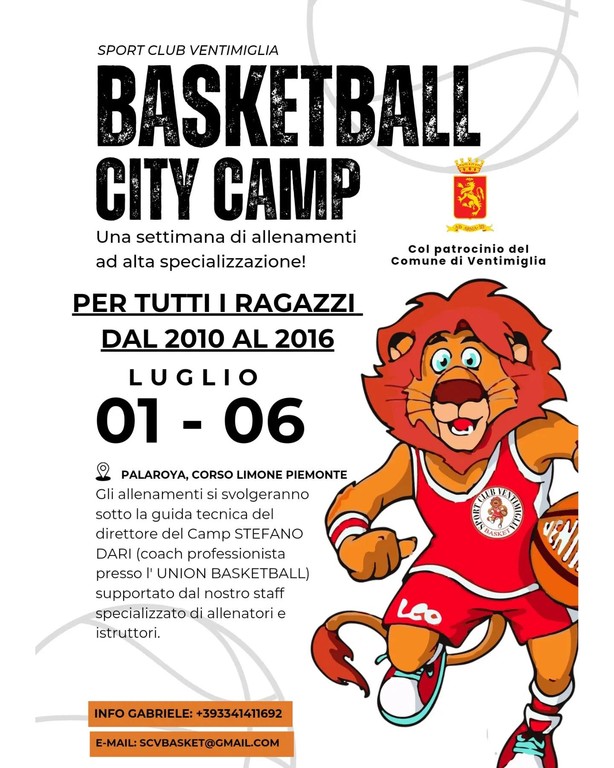 Andrà in scena al PalaRoya di corso Limone Piemonte dall'1 al 6 luglio. "Anche per questa stagione organizzeremo il City Camp" - fa sapere lo Sport Club Ventimiglia - "Gli allenamenti si svolgeranno sotto la guida tecnica del direttore tecnico Stefano Dari, coach professionista presso l'Union Basketball, che sarà ben supportato dal nostro staff tecnico specializzato di allenatori e istruttori e dalla new entry Alessandro Scarfò".