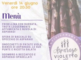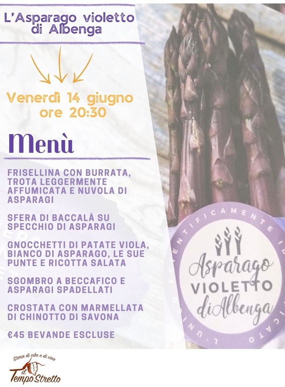 Venerdì 14 giugno, a partire dalle ore 20.30, l'Osteria del Tempo Stretto vi invita a una serata speciale dedicata al prelibato Asparago Violetto di Albenga. Un'occasione unica per gustare un menù raffinato creato dalla chef Cinzia, dove questo ortaggio pregiato dal colore intenso e dal sapore delicato sarà il vero protagonista.