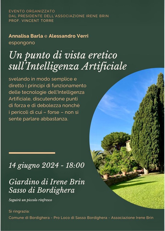 "Qual è il nocciolo innovativo dell'intelligenza artificiale? Qual è la differenza sostanziale tra intelligenza artificiale e umana?". Sono solo alcune delle questioni che verranno affrontate oggi, il 14 giugno, alle 18, nel giardino di Irene Brin a Sasso, frazione di Bordighera nel corso della conferenza dal titolo "Un punto di vista eretico sull'intelligenza artificiale".