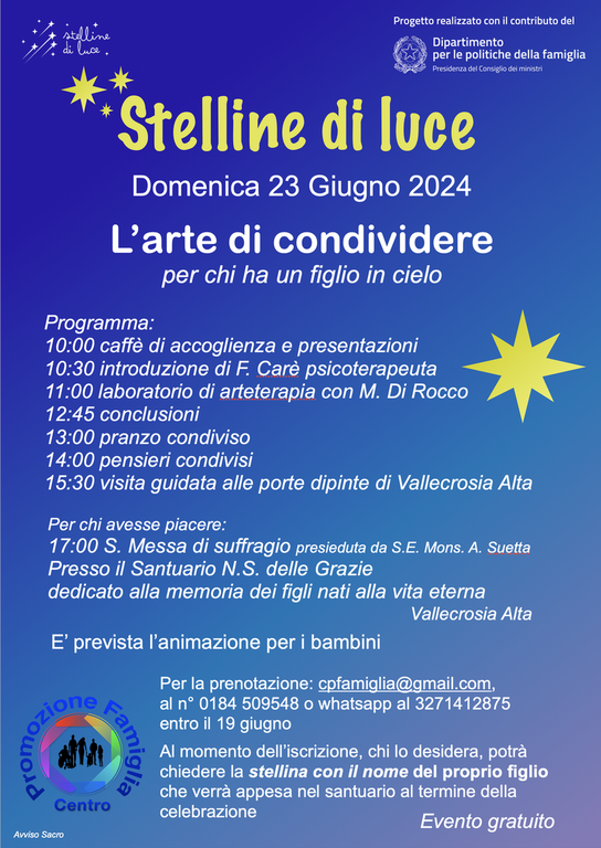 Chi avesse piacere potrà anche partecipare alle 17 alla S. Messa in suffragio e prenotare una stellina con il nome del proprio figlio da mettere nel santuario di N.S. delle Grazie dedicato ai figli nati alla Vita Eterna. E’ prevista l’animazione dei fratellini.