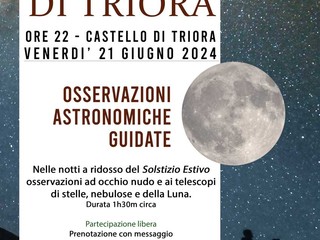 Una ‘serata astronomica’ per scoprire le meraviglie del cielo stellato, illuminati dalla prima Luna Piena d'Estate e immersi nell'atmosfera medievale di Triora. Un connubio affascinante tra le meraviglie del cielo stellato e gli splendidi panorami del nostro entroterra.
