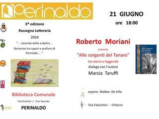Moriani, per l'occasione, presenterà "Alle sorgenti del Tanaro. Tra storia e leggenda". Dialogherà con l'autore Marzia Taruffi. L'incontro sarà animato dall'esposizione di Matteo De Villa e dall'esibizione alla chitarra di Elia Faleschini.